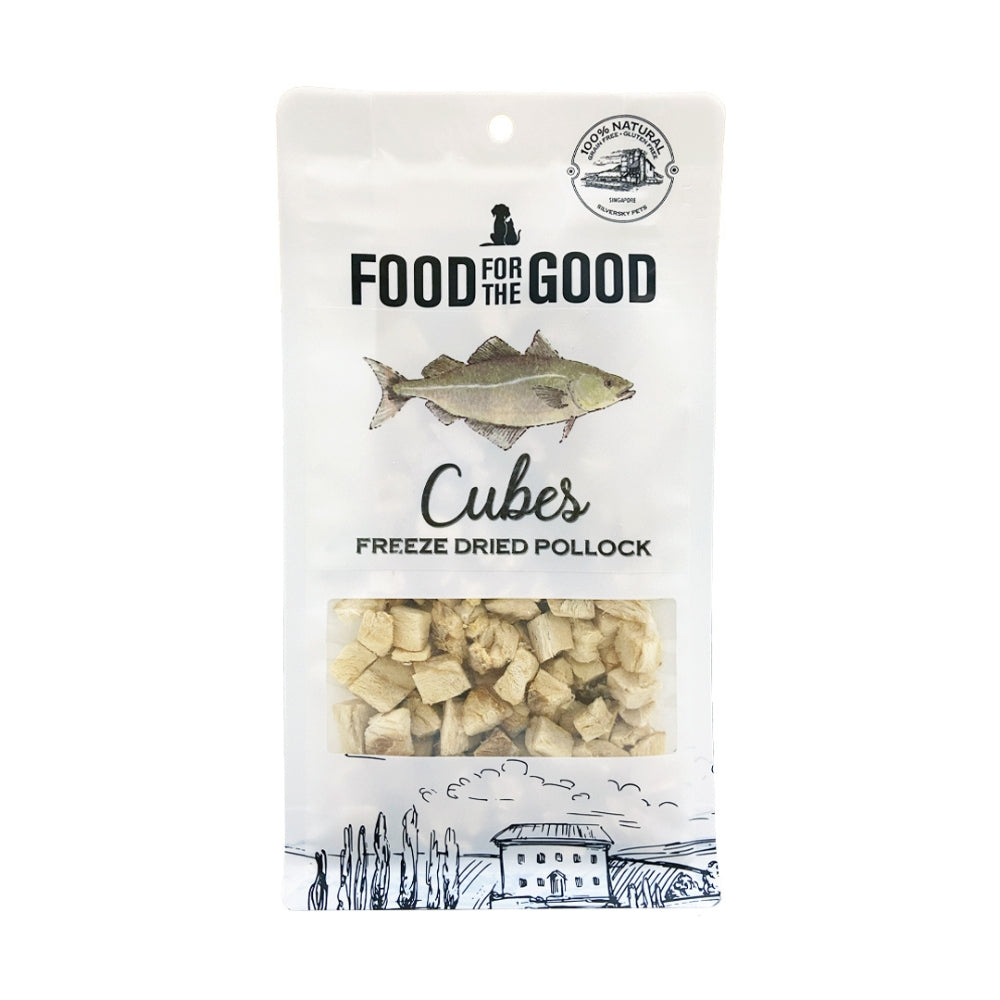 Food For The Good Freeze Dried Pollock Cubes is an excellent source of protein, suitable for both dogs and cats. Made from 100% Pollock, the treats are gently Freeze Dried to retain all the nutrients and flavor your pet craves! These treats are grain-free, gluten-free, without any added preservatives and antibiotics.