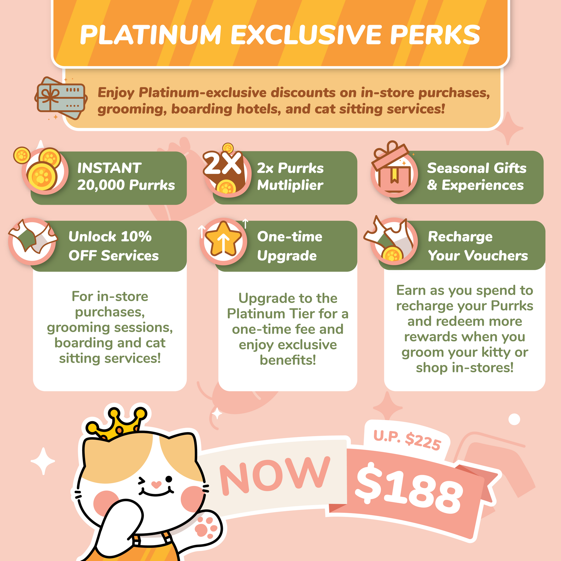 - Instant 20,000 Purrks: Upon purchasing Platinum Tier, 20,000 Purrks will be credited into your account to redeem 10% off vouchers.