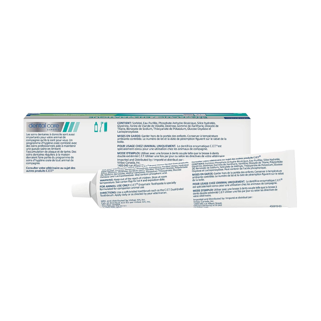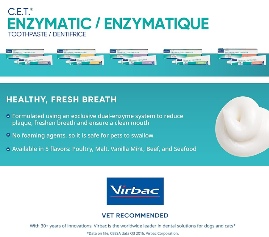 Great tasting toothpaste specifically formulated for pets. Clinically proven to reduce tarter and plaque build-up. Dual-enzyme system for effective antiseptic action. Safe for pets to swallow.